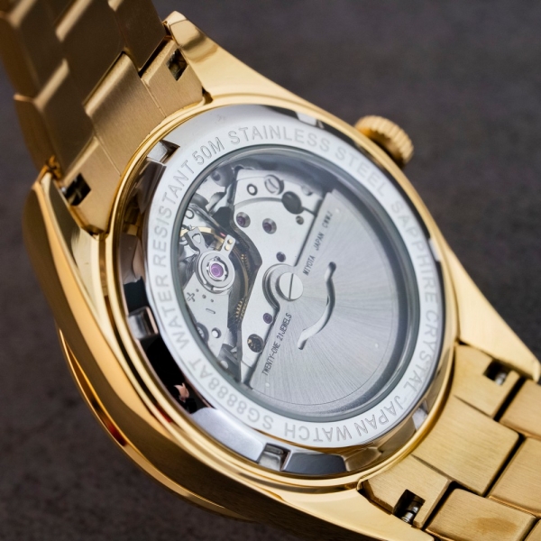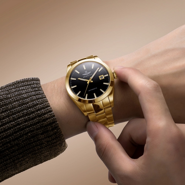 Đồng hồ nam SG8888.1401AT thiết kế sang trọng với vỏ máy và dây đeo bằng thép không gỉ mạ vàng công nghệ PVD mạnh mẽ cho phải nam. Các cọc số và bộ 3 kim chỉ thanh mảnh hài hòa cùng nền màu đen sang trọng. Mặt kính sapphire cong chống trầy, cùng với độ chống nước 5ATM giúp bảo vệ bộ máy bên trong giúp người dùng thoải mái trong mọi hoạt động. Đồng hồ được trang bị một lịch ngày tiện lợi.